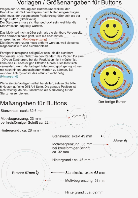 Vorräte buttonpapier vorlagen 38mm 50x weiß din a4 buttonpapier vorlagen "bedruck mich" 50x weiß in der größe 38mm günstig online bestellen große auswahl an buttons und zubehör im lineshop buttonpapier weiß zum bedrucken für ruck zuck buttons bitte beachten sie dass wir uns in der zeit vom 29 09 bis 15 10 18 im betriebsurlaub befinden und in sem zeitraum eingehende bestellungen erst nach buttonpapier günstig bestellen in bester qualität das bedruckbare buttonpapier mit perforierten kreisen gibt es beispielsweise in den größen 25mm 56mm und 59mm auf nachfrage ist es auch mit einem größeren durchmesser erhältlich falls sie buttonpapier bestellen das für gewerblichen gebrauch ausgelegt ist dann eignet sich zu sem zweck das format 25mm am besten
