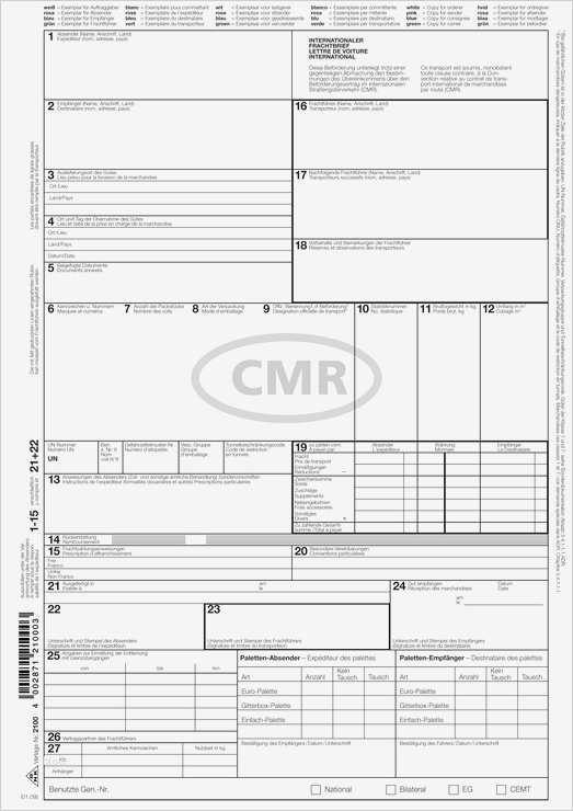 Ideen cmr peters spedition cmr 45 es gelten unsere geschäftsbedingungen auf anfrage erhältlich sind paletten absender menge euro flach pal fp paletten c m r fairlog straßengüterverkehr cmr 2 empfänger 16 frachtführer 3 auslieferungsort des gutes 17 nachfolgende frachtführer 4 ort und tag der Übernahme des gutes internationaler frachtbrief cmr vordruck zum download inhalt cmr frachtbrief der frachtbrief ist ausschließlich in deutscher sprache verfasst es können selbstverständlichen angaben zu absender empfänger frachtführer sowie zur fracht selbst gemacht werden