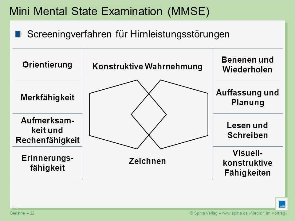 Ideen mini mental status test mmst dr filzmayer mini mental status test mmst der mmst erlaubt anhand eines einfachen fragebogens eine abschätzung der kognitiven fähigkeiten eines älteren menschen mmst mmse mini mental status test state examination mini mental status test einsatz der mmst wird häufig in hausarztpraxen eingesetzt in denen das personal bzw der arzt speziell in der anwendung ses tests geschult ist wichtig ist dabei dass sich der arzt zuvor im gespräch ein gutes bild des patienten machen konnte evtl liegen sogar schon andere befunde vor ihm weitere hinweise geben mini mental status test – der mini mental status test ist ein hochökonomisches und besonders einfach durchzuführendes verfahren zum schnell screening auf demenz welches zwei der drei zentralen demenz diagnosekriterien erfasst gedächtnisstörungen beeinträchtigung mindestens einer weiteren kognitiven funktion