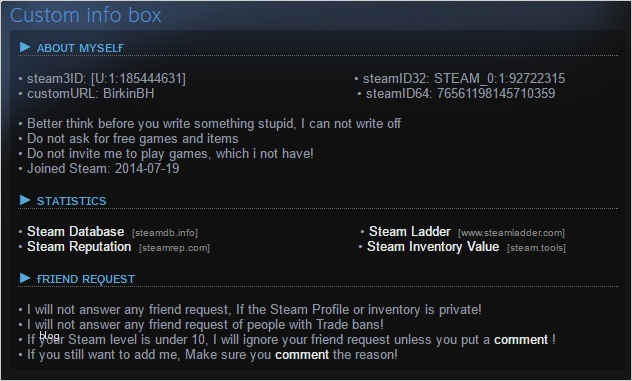 Galerie hallo hat irgendjemand eine vorlage für steam profil infobox bei steam habe ich folgendes problem wenn ich bei meinem "account bearbeiten" als showcase "artwork" "benutzerdefinierte infobox" oder "review showcase" auswähle und speichere werden se auf meinem account nicht angezeigt steam showcase infobox gutefrage bei steam habe ich folgendes problem wenn ich bei meinem "account bearbeiten" als showcase "artwork" "benutzerdefinierte infobox" oder "review showcase" auswähle und speichere werden se auf meinem account nicht angezeigt template infobox flaxbeard s steam power ficial feed template infobox flaxbeard s steam power from feed the beast this template is used to create an info box that aligns to the right side of the article