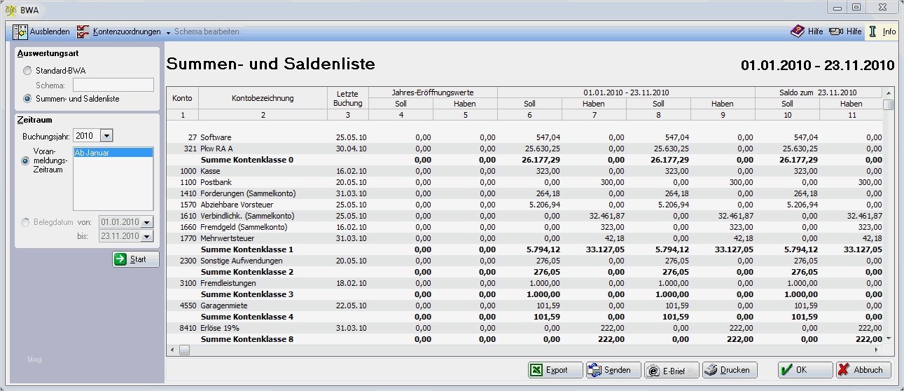 Bilder musterauswertungen rechnungswesen Übersicht und inhalt mandant fibua mustermandant rechnungswesen datum 02 11 2009 seite 1 zeitraum vom 01 01 2009 31 12 2009 summen und saldenliste sachkonten kontenblatt – keine summen salden liste pierre tunger eine summen salden liste ist ein konstrukt aus der doppelten buchhaltung doppik nur hier gibt es anfangs und endbestände bei der gewinnermittlung anhand einer einnahmen Überschuss rechnung eÜr ist s nicht notwendig summen und saldenliste onlinehilfevoware summen und saldenliste klicken sie in der programmstartleiste auf "finanzbuchhaltung" "listen" "summen und saldenliste" die summen und saldenliste zeigt salden aller konten eines bestimmten zeitraums und ad rt alle soll und habensalden zu einer gesamtsumme bei bestandskonten wird gesamtsumme als sa bil