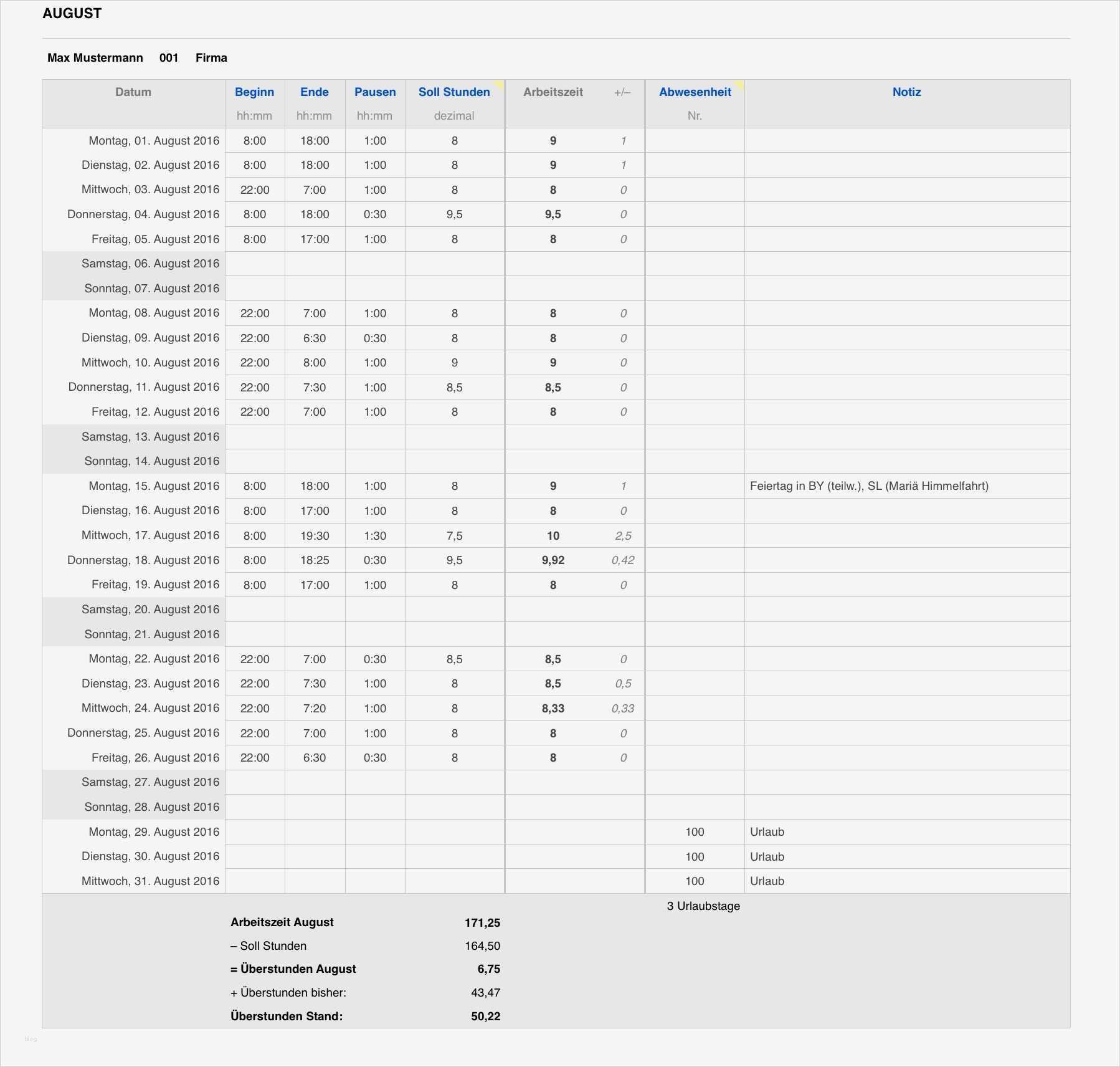 Cool Tabelle Arbeitszeiten Vorlage