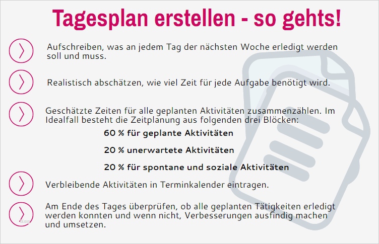 Ideen tagesplanung und tagesrückschau blueprints ein tagesplan sollte mühelos zu erstellen sein und einen guten Überblick über aufgaben und termine geben outlook lotus notes oder andere programme haben integrierte kalender sich hervorragend eignen aber auch der klassische kalender hat vorteile verhaltenstherapeutische verfahren bei depressionen auf den tagesplan sollten außerdem ruhepausen stehen dies können zeiten sein wenn der depressive mensch einfach mal nichts macht der tagesplan sollte so aufgestellt werden dass der patient auf keinen fall damit überfordert ist noch ein tipp zum schluss die aktivitäten auf dem tagesplan sollten konkretisiert werden tagesplan für eine woche tagesplan für eine woche mit der excel vorlage tagesplan kann der inhalt von bis zu 5 tagen geplant werden die vorlage ist leicht auf eigenen bedürfnisse anpassbar