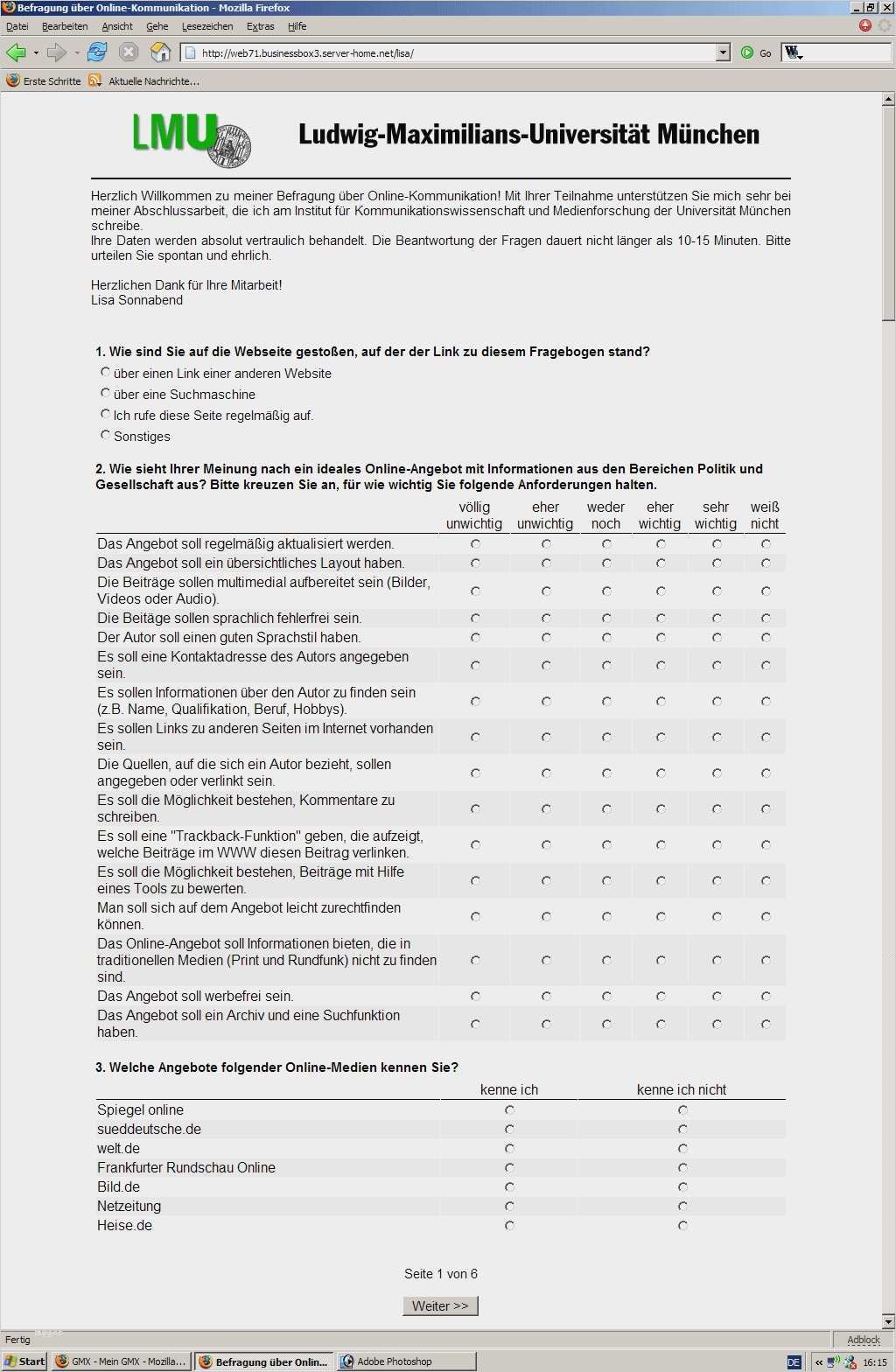 Galerie umfrage usability fragebogen nutzerbefragung der fragebogen wird meist für praxisorientierte evaluation interaktiver produkte oder auch zur nachbefragung bei usability tests verwendet vergleiche zwischen zwei produkten sowie eine vorher nachher untersuchung sind ebenfalls möglich die befragung kann frei zugänglich sein oder es gezielt mittels einladung per e mail dazu eingeladen werden in beiden fällen erfolgt datenerfassung selbstverständlich anonym evaluation usetree fragebogen usetree – berliner kompetenzzentrum für usability maßnahmen – ©2014 – dieser fragebogen lässt sich sowohl online als auch als pen and paper version verwenden das ausfüllen geht recht zügig und dauert um 5 minuten umfrage usability fragebogen nutzerbefragung umfrage usability fragebogen nutzerbefragung schriftliche befragung line fragebogen usability toolkit tipp relative schriftgrößen für ein barrierefreies web die reine schriftvergrößerung [barrierefreies webdesign]