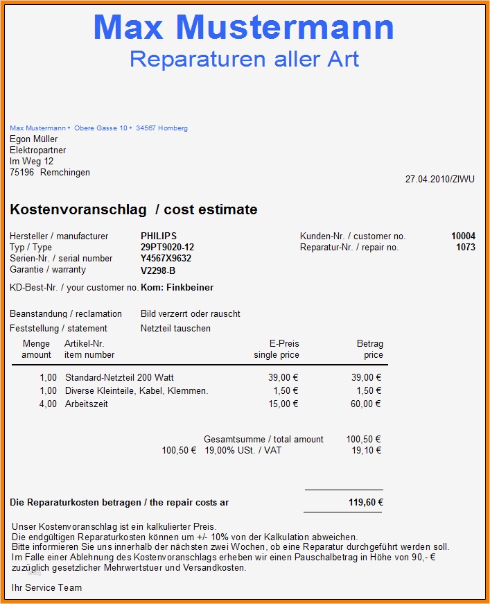Cool Vorlage Kostenvoranschlag