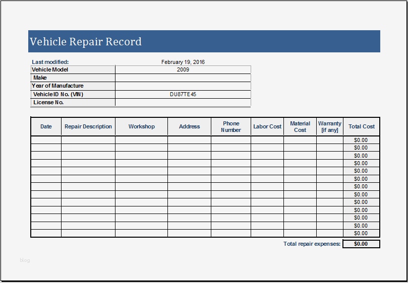Vorlage Lose Excel Wunderbar Vehicle Repair Log Template for Ms Excel