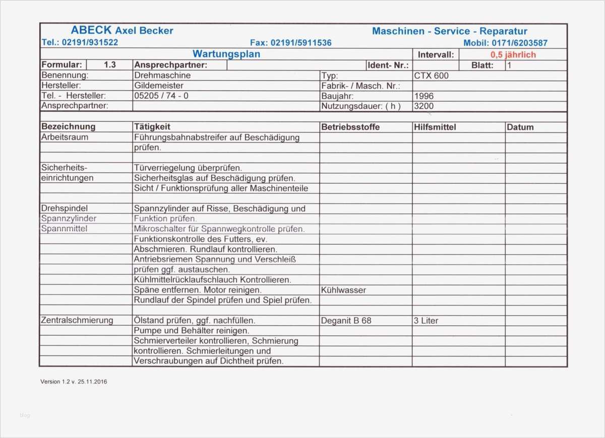 Bewundernswert Wartungsplan Maschinen Vorlage